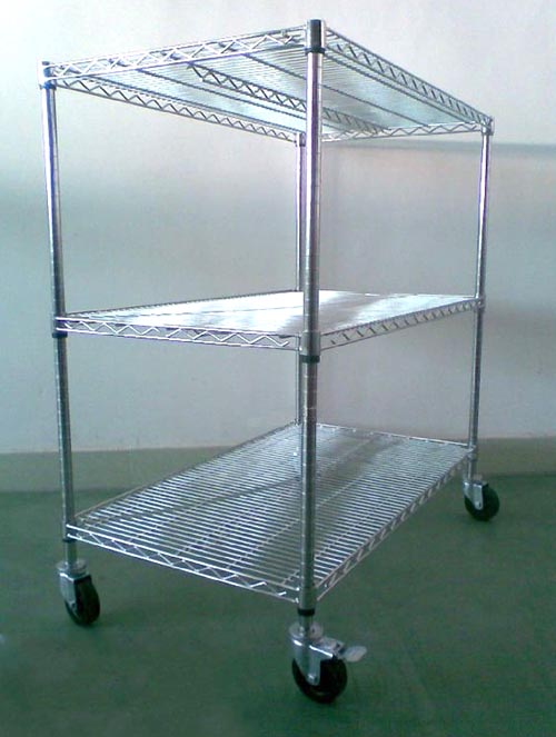 此产品为镀铬货架。货架是现代化仓库提高效率的重要工具,随着经济飞跃发展,外资企业大量涌进我国长江三角洲、珠江三角洲一带,不仅带动了当地经济的发展,还带来新的管理理念和管理技术。目前企业仓储库房所用到的货架种类越来越趋向于自动化、智能化。